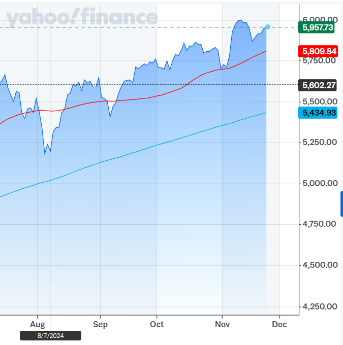The chart below shows the S&P 500 over the last five months, along with the 50- and 200-day moving averages (red and blue lines respectively). This trend, for now, is still clearly positive.